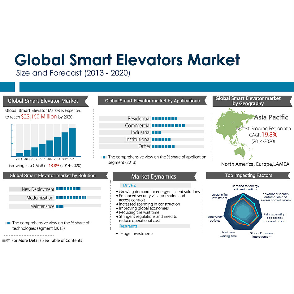 • Global market for smart elevators applications is gaining momentum with residential and industrial usages to provide major growth during the forecast period (2014 – 2020)