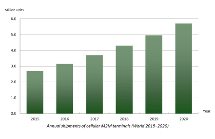 Shipments of cellular M2M terminals will reach 5.7 million units in 2020